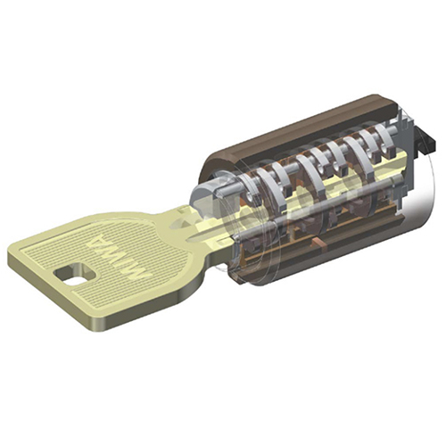 ? 標準の子カギ(合カギ)を差し込むと、タンブラーはキーのきざみによって押され、切欠がロッキングバーの上方に くるまで回転、整列します。この状態で内筒を回転させようとすると、溝とロッキングバーとのテーパーによって、スプリングに抗してロッキングバーが上方に押し上げられ、内筒を 回転させることができます。
