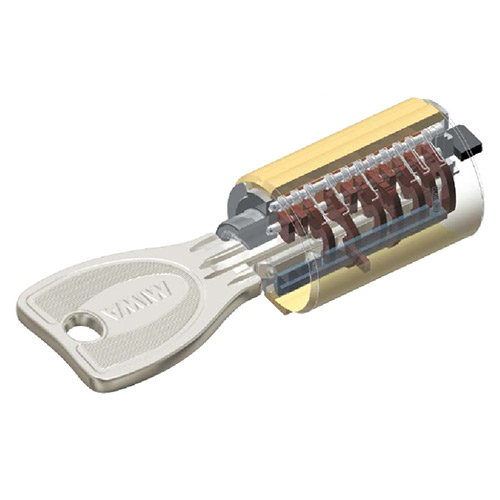 ? 合カギを差し込むと、タンブラーはキーの刻みによって押され、切欠がロッキングバーの上方にくるまで回転・整列します。 この状態で内筒を回転させようとすると、溝とロッキングバーとのテーパーによって、スプリングに抗してロッキングバーが上方に押し上げられ、内筒を回転させることができます。